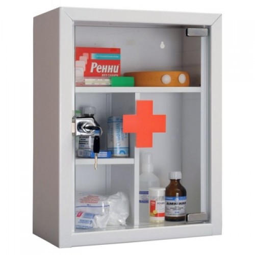 Аптечка с стеклянной дверцей для размещения и контроля за содержимым. Габариты составляют В:390 *Ш: 300 * Г:160 мм. Отверстия для крепления к стене. Ключевой замок на двери.